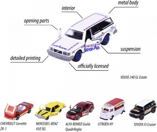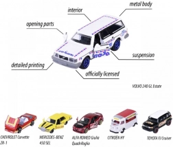 U kolekciji ćete pronaći legende kao što su CITROËN HY (1968), MERCEDES-BENZ 450 SEL (1975), VOLVO 240 GL (1985), CHEVROLET CORVETTE ZR-1 (1990) i ALFA ROMEO GIULIA (2015).