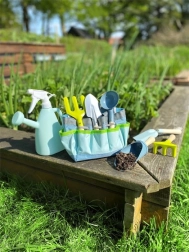 Šest robusnih alata (lopatice, štihača, mjerica, grabljice i vile) s drvenim ručkama dizajnirano je za male vrtlare.