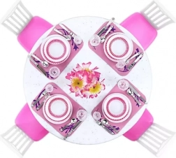 Set uključuje okrugli stol, 4 stolice, dva tipa tanjura, podloške, puni pribor za 4 osobe, 8 čaša i dekorativnu vazu s cvijećem – sve usklađeno u elegantnoj bijelo‑ružičastoj kombinaciji.