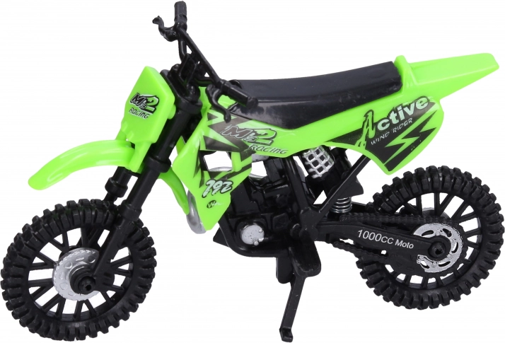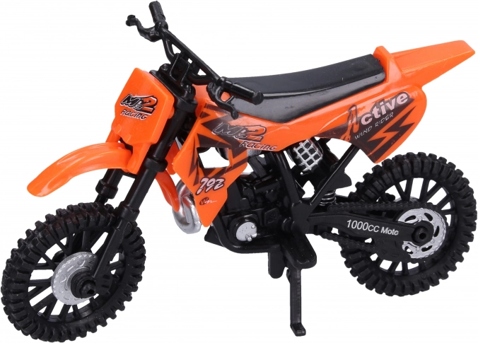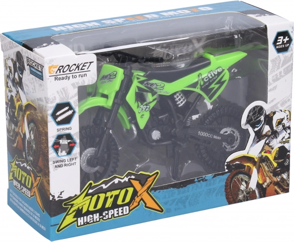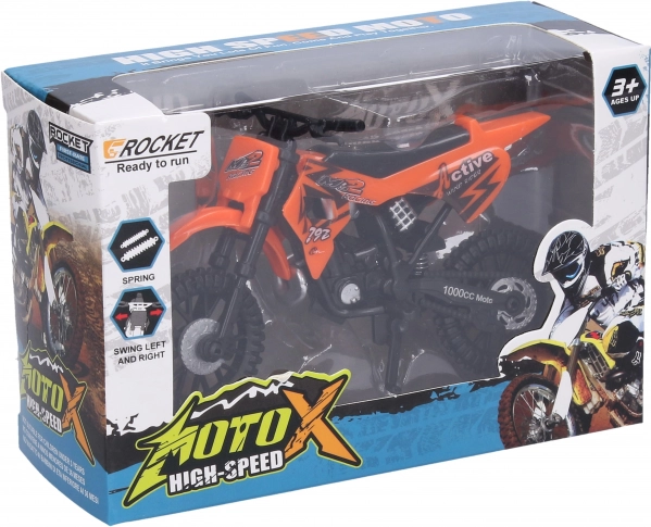 Kompaktna terenska motorcikl igračka veličine 12 cm razveselit će male natjecatelje svojim realističnim izgledom i jednostavnim upravljanjem. Ima slobodno okretajuće kotače, dostupna je u 3 varijante boja (narančasta, zelena, plava) i izvrsno je prikladna za igru kod kuće i na putu.