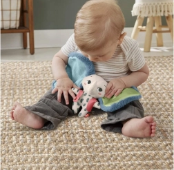 Senzorička mekana igračka u obliku slonića nudi bogate taktilne poticaje: nježni pliš, satenske detalje i šuškave elemente. Kontrastne nijanse plave i zelene privlače pažnju i potiču razvoj vida, dok lako prihvatljivi oblici pomažu vježbati finu motoriku i koordinaciju ruka‑oko.