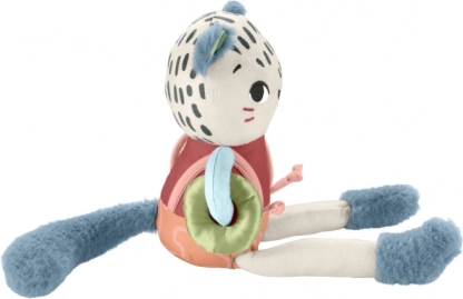 Kontrastni elementi privlače pogled, različite tkanine razvijaju osjet dodira, a šuškavi dijelovi u “cipelici” potiču sluh. Duge nožice, uši, remenčići i klizni prsten potiču na hvatanje i vježbanje fine motorike.