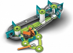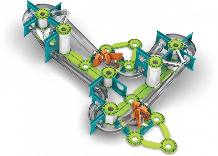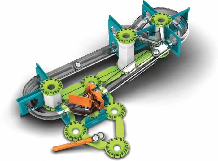 Sastavite vlastitu trkaću stazu, napunite kuglicu i gledajte kako je magnetski top izbacuje po stazi. Zahvaljujući gravitacijskom pogonu i rotirajućim dijelovima pokreću se impresivne lančane reakcije koje djeci razumljivo prikazuju zakonitosti fizike.
