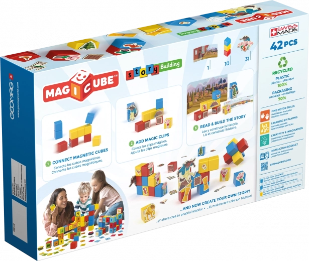 Set sadrži 10 čvrstih magnetskih kocaka i 31 ilustrirani isječak s motivima praščića, vuka i gradnje kućica, pa mali kreatori mogu prepričati poznatu priču ili izmišljati nove. Materijali su zdravstveno neškodljivi i proizvedeni s tipičnom švicarskom preciznošću brenda Geomag.