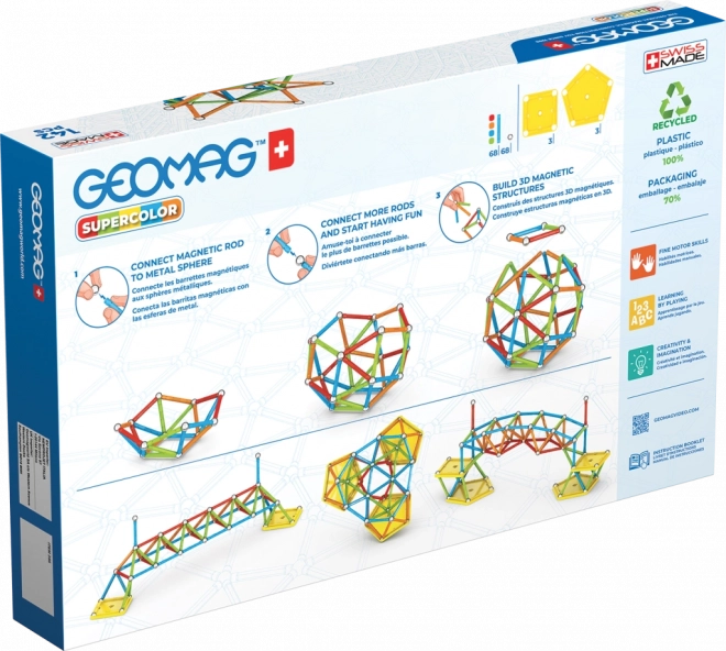Otkrijte kreativni svijet magnetskih konstrukcija s građevnim setom GEOMAG Supercolor od 142 dijela izrađenih od 100 % reciklirane plastike. Šarene šipke, čelične kuglice i podnošci omogućuju izgradnju beskrajnih 3D modela koji razvijaju kreativnost, prostornu maštu i finu motoriku. Švicarska kvaliteta, sigurni materijali i dugotrajnost čine ovaj set idealnim izborom za djecu i odrasle.