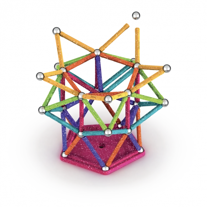 Uz set Geomag Glitter lako ćete sastaviti sve, od jednostavnih oblika do razrađenih 3D konstrukcija. Šarene šipke s blistavim efektom u kombinaciji s čvrstim čeličnim kuglicama i postoljima omogućuju stabilne i dojmljive modele koji potiču djecu i odrasle na eksperimentiranje.