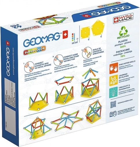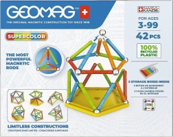 Otkrijte kreativni svijet s magnetskom građevnom igrom GEOMAG Supercolor Panels Recycled s 42 dijela. Snažni magneti, šareni paneli i metalne kuglice omogućuju gradnju raznolikih 2D i 3D konstrukcija te razvoj fine motorike, prostorne predodžbe i kreativnosti. Izrađeno od 100% reciklirane plastike – zabava koja je obzirna prema planetu.