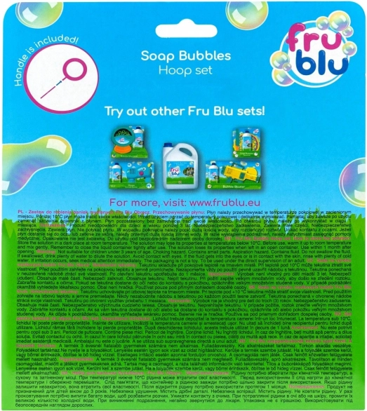 Otkrijte sezonsku novost – kompaktni FRU BLU set s obručem i otopinom 0,4 l. Cijenit ćete jednostavno sastavljanje i spremanje, pa je idealan za vrt, park ili odmor. Dovoljno je uliti otopinu u plitku posudu, uroniti obruč i glatkim pokretima stvarati ogromne, sjajne mjehuriće.