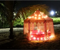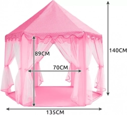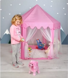 Ovaj ružičasti dječji šator stvara ugodnu „palaču“ u kojoj se razvija dječja mašta. Šesterokutna baza pruža dovoljno prostora za jastučiće, plišane igračke i knjige, dok prozirne zavjesice od mrežice na šest ulaza daju osjećaj privatnosti i ujedno osiguravaju odličnu cirkulaciju zraka. Šator je prikladan za igru za do 2 djece pod nadzorom odraslih.
