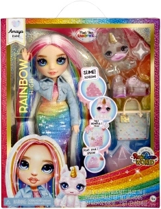 Lutka Rainbow High Amaya spaja modni izgled i beskrajne mogućnosti igre. Duga duginasta kosa mami na češljanje i stiliziranje, blještava haljina i denim jaknica zasjat će na svakoj polici, a zglobna konstrukcija omogućuje dinamične poze – od catwalk stavova do špage.