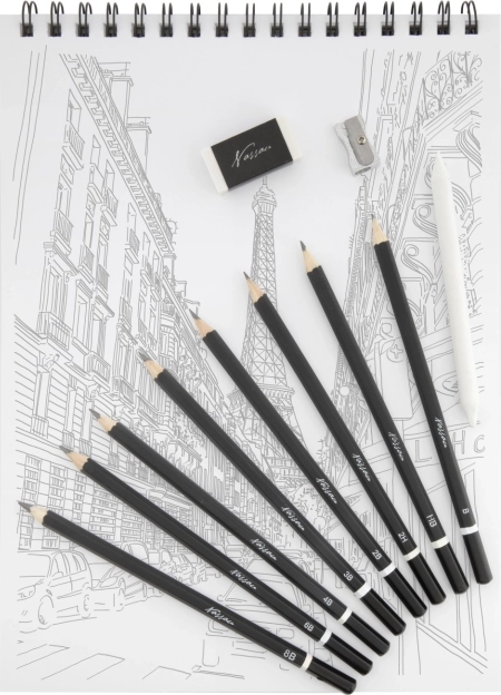 Set za skiciranje sadrži sve što vam je potrebno za stvaranje umjetničkih djela. Oprema uključuje blok sa skic-papirom, šiljilo, gumicu i 9 olovaka različitih tvrdoća za razne stilove i tehnike crtanja.