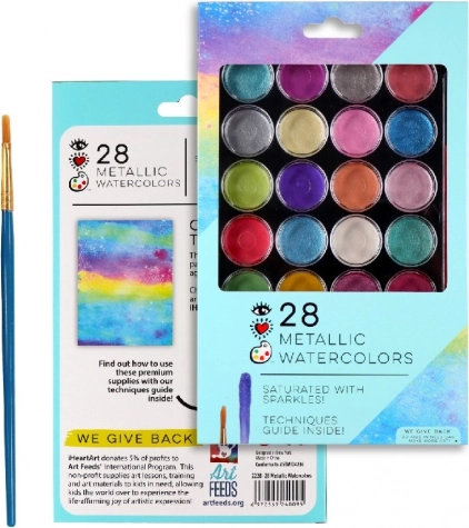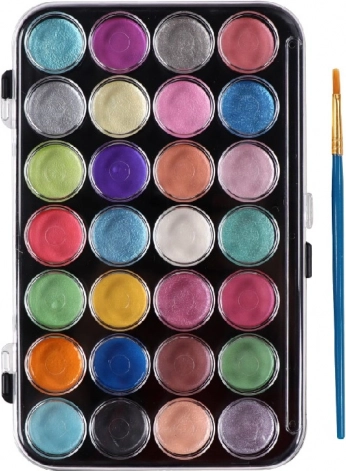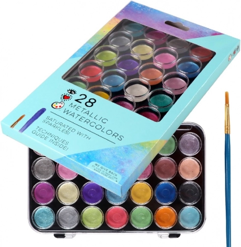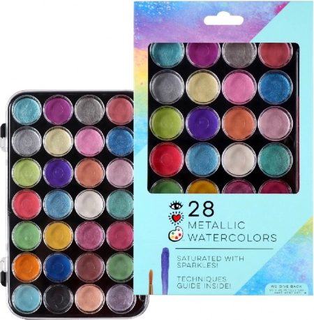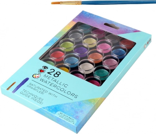 Otkrijte beskrajne mogućnosti igre bojama i stvorite vlastite originalne slike. Ovaj praktičan, kompaktan set od 28 akvarelnih boja u prekrasnim metalik nijansama omogućuje svakome izraziti svoju kreativnost. Set je smješten u plastično kućište koje štiti boje od isušivanja i olakšava njihovu svakodnevnu uporabu. Dio seta su kist i kratki vodič kroz akvarelne tehnike. Zahvaljujući njemu svatko će naučiti kombinirati boje i stvarati nove nijanse. Idealan je poklon za djecu, prijatelje, za svakoga tko voli slikati.
