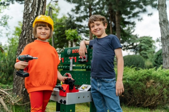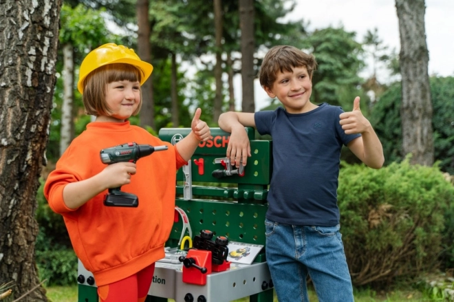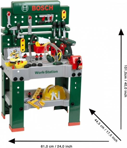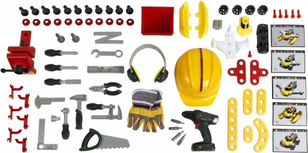 Potpuno opremljeni dječji radni stol proizveden je u Njemačkoj pod Bosch licencom. Ploča stola nudi niz zračnih funkcija, stegu te praktične pretince za odlaganje i policu. Na stražnjoj stijenci stolarske radionice i na polici ispod radne ploče nalazi se prostor za visokokvalitetan pribor od 81 dijela, od kojeg se neke dijelove može objesiti na zid pomoću praktičnih kuka: dječji električni akumulatorski odvijač, ravni i križni odvijač, ključ, francuski ključ, kliješta i turpija, čekić, pila i mjerač, kutnik, ravnalo i stega za vijke. Djeca će naučiti spretno rukovati vijcima, maticama i navojnim dijelovima različitih veličina i oblika te brinuti o sigurnosti zahvaljujući igračkim kacigama i zaštitnim naočalama, štitnicima za sluh i rukavicama. Posebno je zabavno vozilo za samostalnu montažu koje se na radnom mjestu može okretati i ponovno sastavljati. Dječja soba tako postaje prava radionica! Dovoljno je staviti kacigu i zaštitne naočale, navući rukavice i možete početi piliti, zabijati i zavrtati. Vrijednim malim dizajnerima pomaže stega koja drži letvice predviđene za učvršćivanje čavlima ili vijcima. Tu je i akumulatorski odvijač koji uz svjetlo i zvuk zavrće sve što mali žele sastaviti u nešto veliko, a kad je posao gotov, sve se brzo može posložiti na kuke i u kutije.