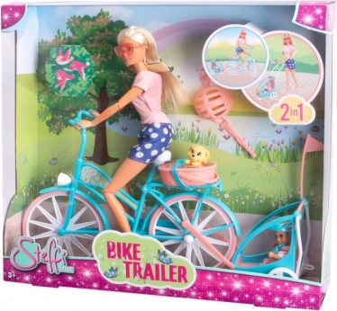 Steffi na biciklu s prikolicom, uključuje dijete, psa i kacigu.