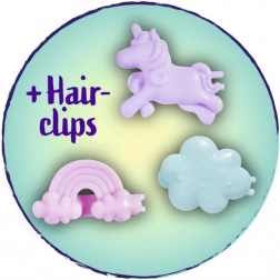 Evi ima dugu ružičastu kosu i šarene ukosnice u obliku oblačića, duge i jednoroga za beskrajne frizure.