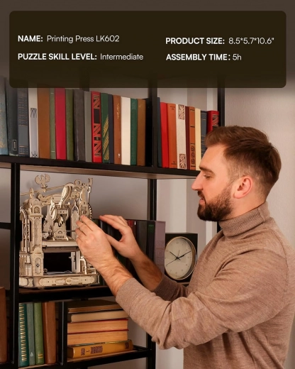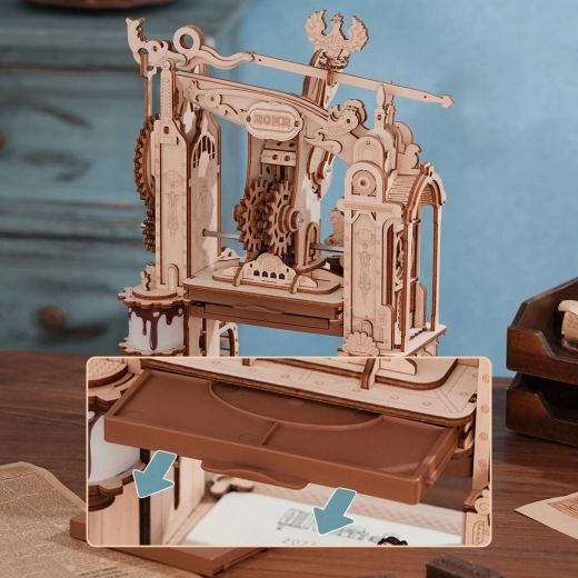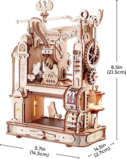Udahnite život klasičnom tiskarskom stroju u jedinstvenom steampunk stilu. Nakon pritiska na ručku zavrte se zupčanici, figurice „tiskarskih medvjedića” pokreću stroj, a po završetku zadatka svjetlo se upali. Bočni srednjovjekovni sat s astrolabom dodaje modelu šarm i autentičnost. Model je idealan kao kreativan DIY projekt, atraktivna dekoracija i pametno edukativno pomagalo za razvoj tehničkog razmišljanja.