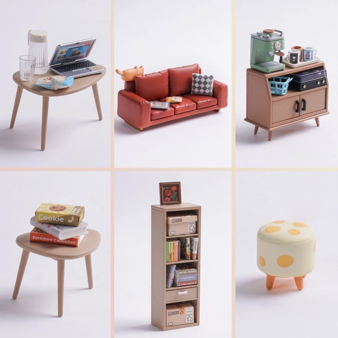 Sofisticirana sofa, knjižnica, stolići i dodaci stvaraju vjernu scenu dnevnog boravka za izlaganje i kolekcionarsko zadovoljstvo.