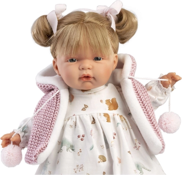 Ručno izrađena lutka Llorens Joelle visine 38 cm oduševljava detaljnom izradom i kvalitetnim materijalima. Ima meki pamučni trbuščić te vinilne ruke, noge i glavu, prekrasne trepavice i oči. Odjeća je šivana od organskog pamuka, vune i recikliranih materijala. Idealan poklon koji spaja igračku i učenje te donosi radost poštene španjolske proizvodnje.