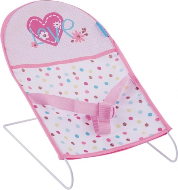 Ljuljačka s metalnim okvirom nudi udobno sjedenje za lutku tijekom igre. Opremljena je sigurnosnim pojasom i tiskom sa srčekima i cvjetićima.