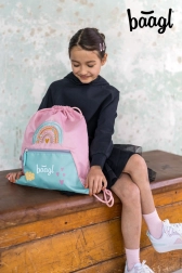 Praktična školska vrećica BAAGL za obuću i aktivnosti u slobodno vrijeme u elegantnom ružičastom dizajnu Duga. Nudi čvrst periv materijal, praktičan džep na patentni zatvarač u donjem dijelu i zatvaranje pomoću čvrstih vezica, koje omogućuju udobno nošenje na leđima. Zahvaljujući karabineru lako je pričvrstite na aktovku.