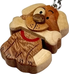 Drveni privjesak za ključeve s motivom psa s kosti je idealni dekorativni dodatak za vaše ključeve, torbice ili ruksake. Ručno izrađen od pet različitih vrsta drva, oduševit će svojom prirodnom paletom boja i prirodnim izgledom.