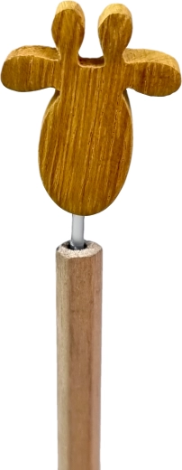 Drvena olovka s glavom žirafe idealna je za ljubitelje prirode i životinja. Svaka je olovka jedinstvena zahvaljujući kombinaciji do pet različitih vrsta drva: žuti kruhovac raznolisni, svjetlosmeđi tamarind manilski, tamnosmeđa kasija obična, ružičasta aniba i bijela gmelina arborea. Proizvod nije bojan, već samo ručno doslikan, što čuva prirodnu ljepotu drveta.