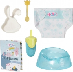 Set uključuje bočicu, dudu, dudu s trakom, pelene i druge dodatke za potpunu njegu i igru.