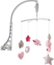 Umirite bebu nježnim pokretom i melodijom koju nudi ovaj ružičasti vrtuljak iznad krevetića sa sovičicom. Zahvaljujući navijačkoj glazbenoj kutiji i mekanim visećim oblicima (zvjezdice, srca, mjesečić) pomaže zabaviti i uspavati djecu. Jednostavna montaža na krevetić i nježne pastelne boje idealne su za svaku dječju sobu.