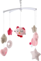 Ružičasti glazbeni vrtuljak iznad krevetića sa sovičicom donosi djeci mir i osjećaj sigurnosti. Mekani viseći elementi u obliku zvjezdica, srca i mjesečića nježno se njišu, dok mehanička navijačka kutija reproducira ugodnu melodiju. Tih rad i vizualno ugodne pastelne boje doprinose umirujućoj atmosferi prije spavanja.