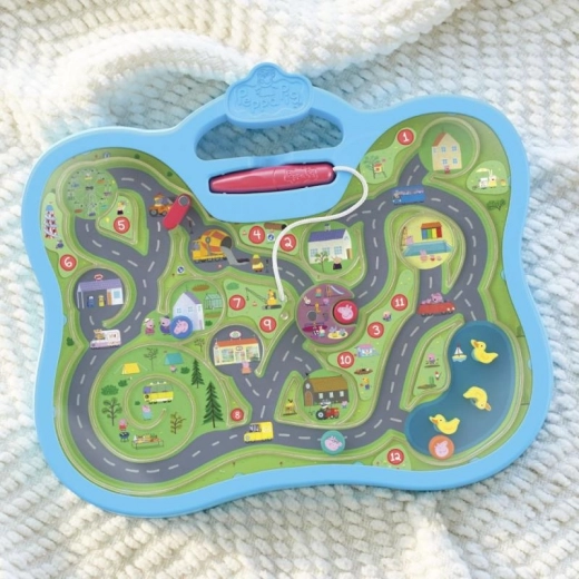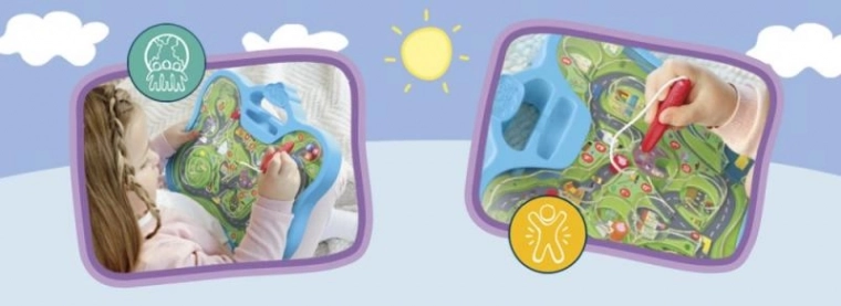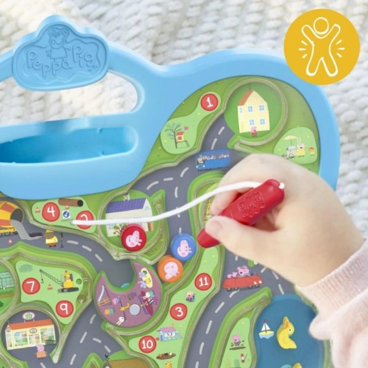 Stabilna ploča s integriranom ručkom i čvrsto pričvršćenim stylusom odlična je za igru kod kuće i na putu. Numerirana stajališta podržavaju učenje brojeva i sekvenci, dok živopisne ilustracije omiljenih lokacija iz crtića Peppa Pig zadržavaju pažnju i motiviraju na daljnje istraživanje.