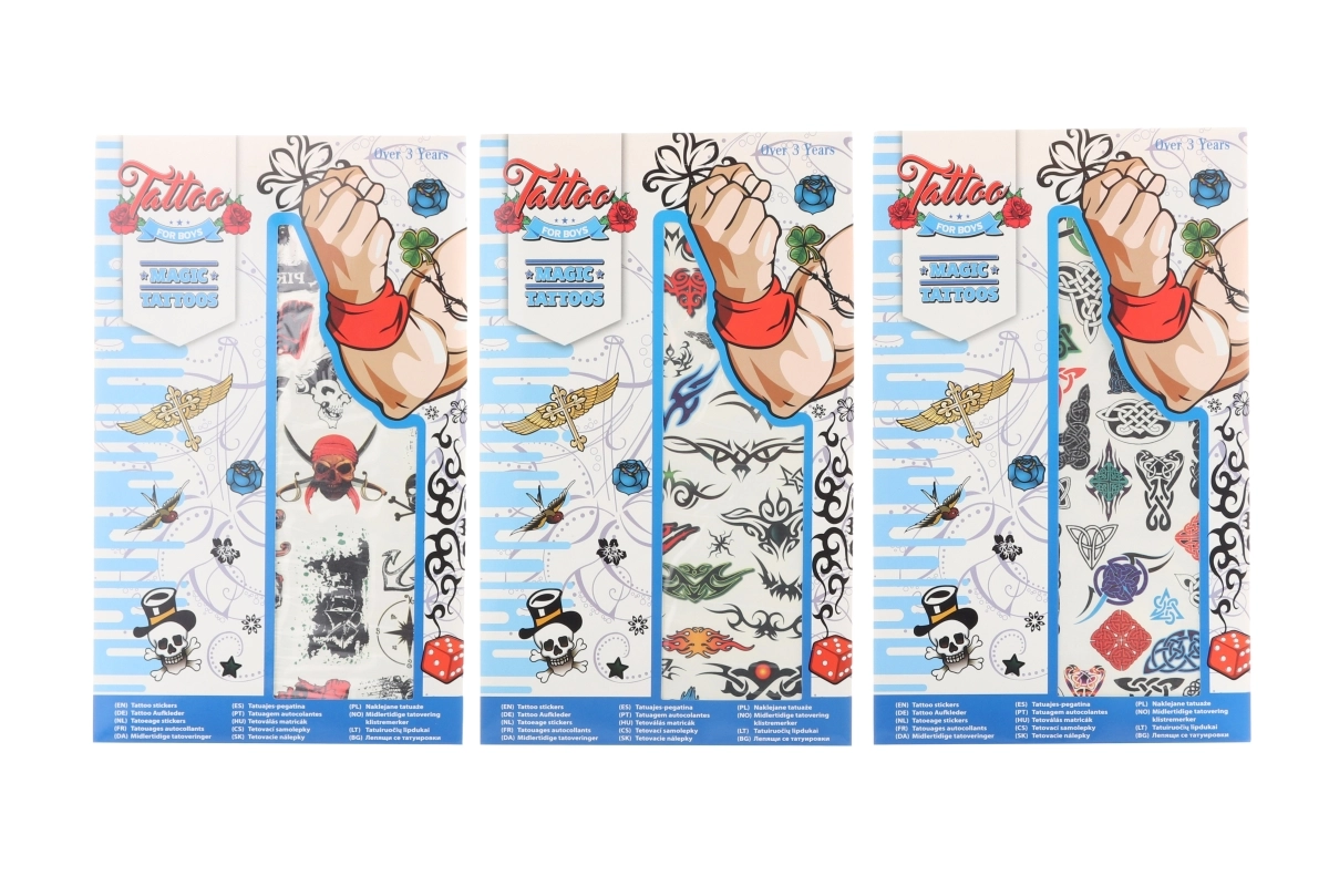 Set privremenih tetovaža za dječake nudi raznolik izbor motiva koji će oduševiti male avanturiste. Tetovaže se lako prenose na kožu pomoću vode i prirodno se ispiru nakon nekoliko dana. Odlično kao mali pokloni, nagrade ili dodatak kostimima.