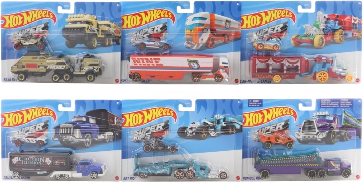 Ovaj transportni set donosi akcijsku igru: kamion + autić 1:64 spremni za prijevoz i utrke. Kompatibilno sa stazama HOT WHEELS, potiče kreativnu igru i razvoj mašte. Različiti modeli i boje (mogu se razlikovati), od 3 godine.