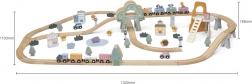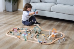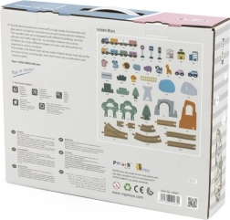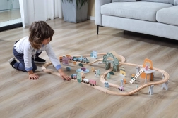 Opsežan set uključuje tračnice, uzvišenja, most, vlakić s vagonima te mnoštvo dodataka. Djeca lako mijenjaju rute i stvaraju nove priče pri svakoj igri.