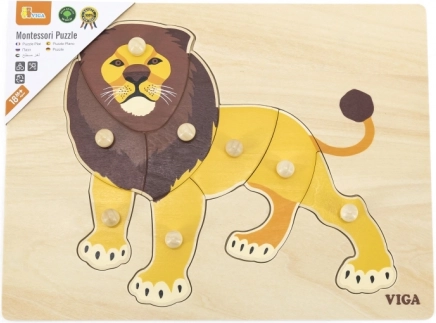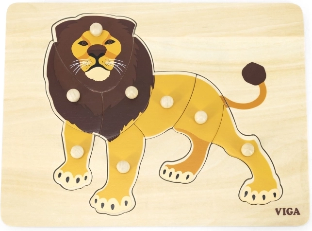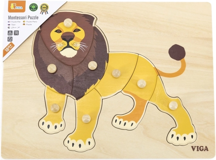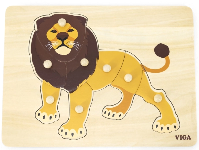 Drvena slagalica s veselim lavom savršen je izbor za prvu puzzle vašeg djeteta. Zahvaljujući udobnim gumbastim rukohvatima, pojedini se dijelovi lako hvataju i umeću na pravo mjesto, što prirodno razvija motoriku prstiju i strpljenje. Šarena ilustracija lava motivira djecu na igru i učenje.