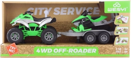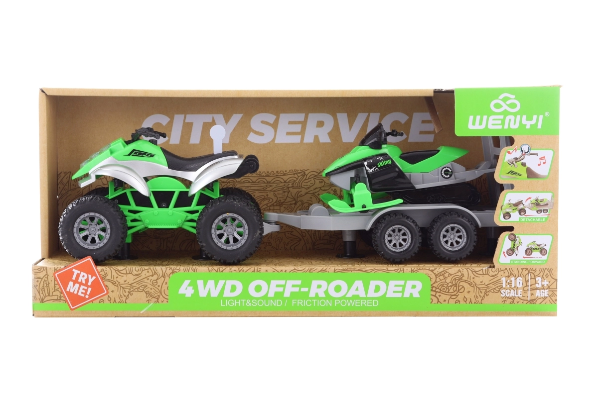 Ovaj realistični četverocikl s prikolicom i priloženim skuterom potiče dječju maštu i finu motoriku. Zahvaljujući svjetlosnim i zvučnim efektima igra je još privlačnija, a djeca lako mogu stvarati vlastite avanturističke scenarije.