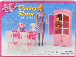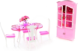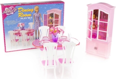 U setu su veliki stol, četiri stolice, kredenca i potpuni stolni dodaci. Sve je izrađeno od izdržljive plastike i prilagođeno jednostavnom rukovanju dječjim rukama.