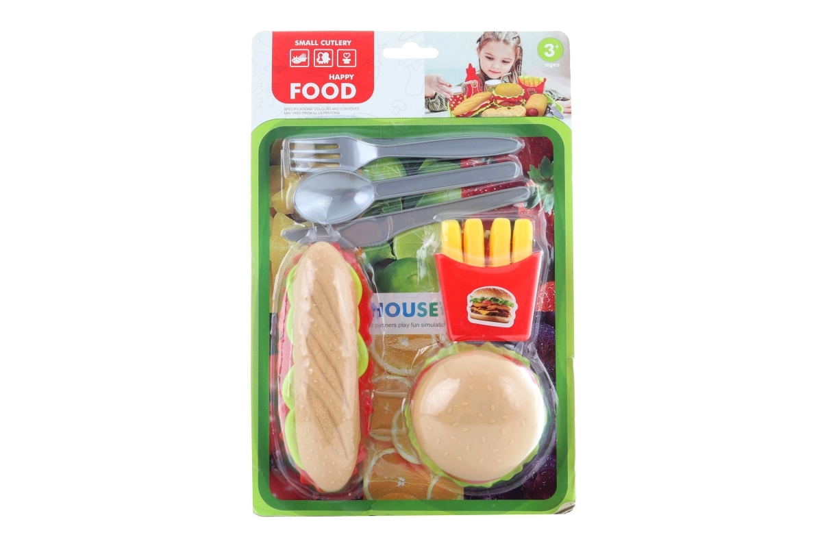 Zabavan plastični set hrane za male kuhare. Pakiranje sadrži bagetu, hamburger, pomfrit u kutijici i pribor za jelo. Idealan za igru kuhinje i razvoj mašte. Sigurna plastična izrada, omiljene vrste hrane i sjajna igračka za djecu od 3 godine.