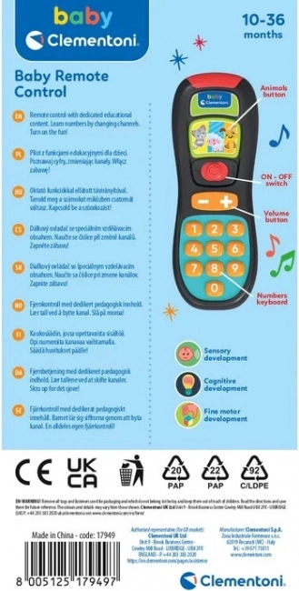 Ovaj dječji upravljač oponaša pravi daljinski upravljač i pretvara svakodnevnu igru u otkrivanje. Dijete pomoću tipki vježba prve brojeve, upoznaje životinje i njihove zvukove te istodobno razvija finu motoriku. Vesele melodije i svjetlosni efekti motiviraju na daljnje istraživanje.
