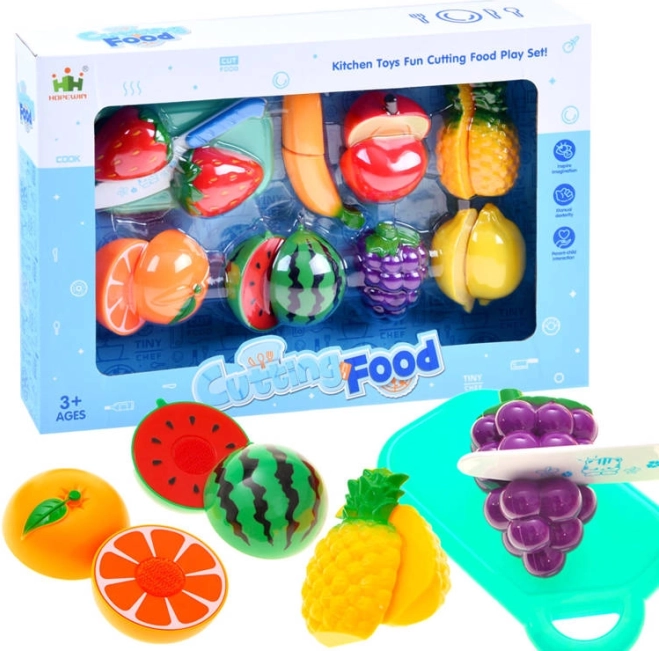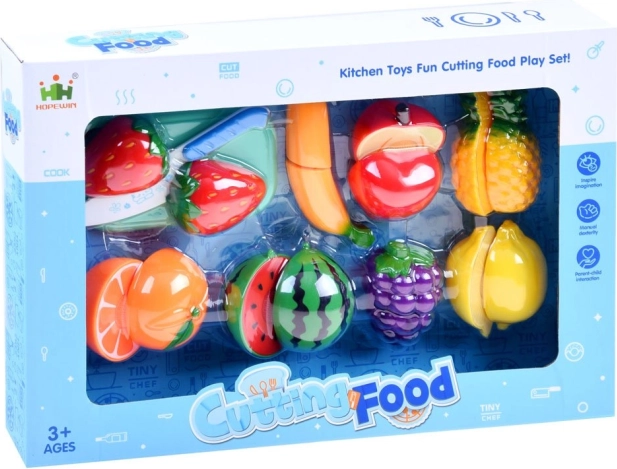 U pakiranju se nalazi daska, siguran plastični nož i popularne vrste voća: jagoda, grožđe, jabuka, limun, ananas, banana, lubenica i naranča. Igra potiče komunikaciju, kreativnost i prirodno učenje kroz zabavu.