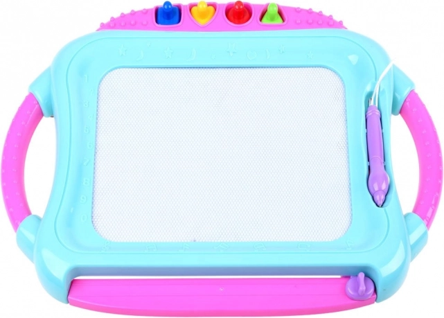Dječja magnetska ploča za crtanje s višebojnom podlogom potiče kreativnost, finu motoriku i učenje oblika i boja. Zahvaljujući velikoj površini, priloženom olovku i 4 pečata, djeca lako crtaju, pišu i stvaraju uzorke – a jednim potezom sve brzo izbrišu.