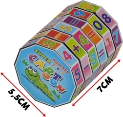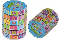 Šarena valjkasta zagonetka s rotirajućim prstenovima pomaže djeci kroz igru usvojiti osnove matematike. Zahvaljujući brojevima i znakovima djeca vježbaju zbrajanje, oduzimanje, množenje i dijeljenje, bilo kada i bilo gdje. Izdržljiva izrada od sigurnih materijala udovoljava normi EN 71, prikladno od 3 godine, a kompaktne dimenzije 7 × 5,5 cm čine ga idealnim pomagalom za putovanja.