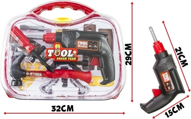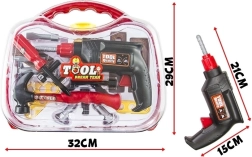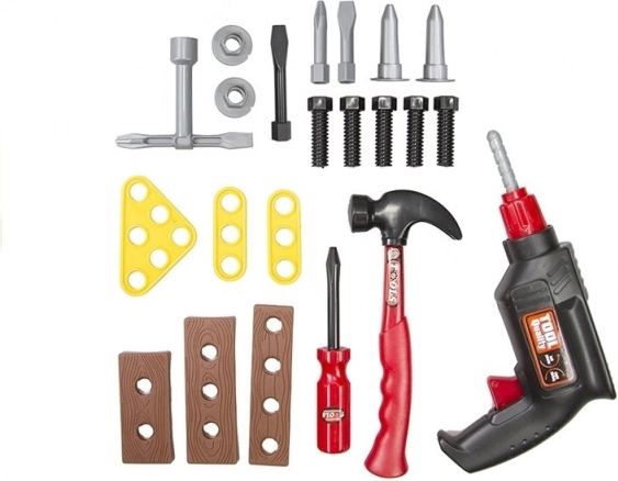 Dio seta je realistična igračka bušilica, funkcionalni odvijač s izmjenjivim nastavcima, čekić, vijci i tri pločice za vježbanje montaže. Sve je izrađeno od lagane, izdržljive plastike sigurne za dječju igru.