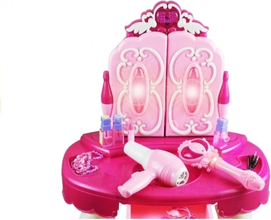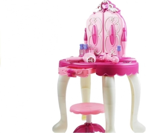 Ispunite san male šminkerice ovim čarobnim kozmetičkim stolićem za djecu. Otvarajuća ogledala na magijski štapić, svjetlosni efekti, glazba, mogućnost spajanja MP3 i funkcionalni dječji fen jamče sate kreativne zabave. Bogat set dodataka uključujući češljić, bočice i perlice potiče maštu i ulogu princeze.