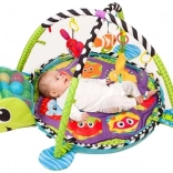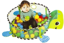 Podloga je osmišljena za raznolike načine upotrebe – dijete se može igrati ležeći na trbuhu, na leđima ili sjedeći. U pakiranju se nalazi 30 šarenih loptica koje se nakon igre jednostavno mogu spremiti u glavu kornjače, čime se igraći prostor pretvara iz bazenčića u podlogu. Podloga također sadrži četiri različite morske igračke za vješanje koje potiču djetetovu znatiželju.