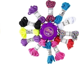 Set uključuje 12 šarenih uzica, promjer uzice je približno 0,5 cm. Svaku možete koristiti za izradu narukvice ili pletenice. U pakiranju se nalazi i uređaj koji olakšava pletenje i izradu narukvica.