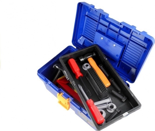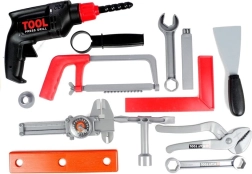 - kofer, bušilica, čekić, ručna pila, francuski ključ, okasti ključ, nasadni ključ, ravni ključ, križni odvijač, ravni odvijač, vijci i matice, pomično mjerilo, špahtla, turpija, libela, kutnici, spojnice s otvorima