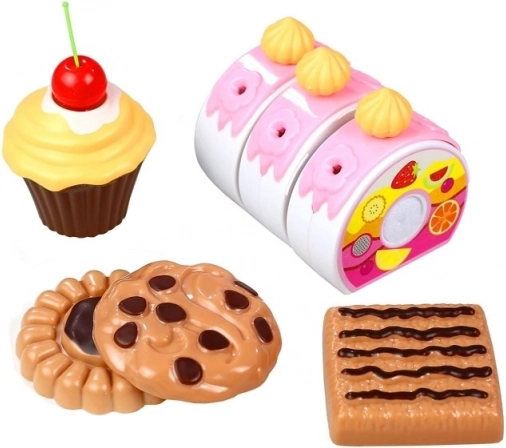 Cupcake, keksi i komad rolade upotpunit će svaku dječju zabavu. Dijelovi su šareni i privlačni za maštovitu igru slastičarnice.