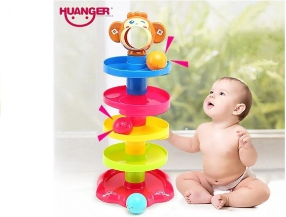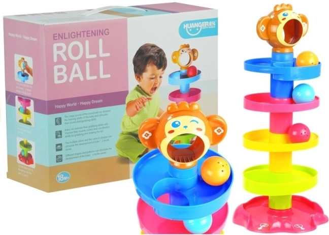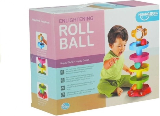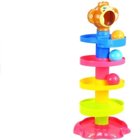 Ova šarena kula s kuglicama sastoji se od stabilne baze, nekoliko spiralnih katova i simpatične glavice majmunčića. Dovoljno je staviti kuglicu u otvor na vrhu i gledati kako se kotrlja niz spirale sve do izlaza označenih brojevima 1, 2 i 3. Unutar kuglica su zvečkajući elementi koji stimuliraju sluh i pomažu djeci razlikovati zvukove.