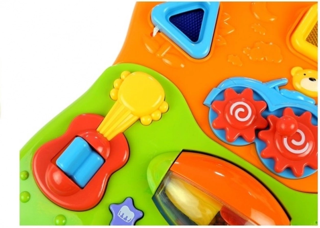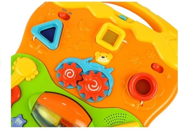 Na panelu dijete otkriva svjetleće zvjezdice sa zvukovima (violina, truba, bubanj), malu klavijaturu za prve melodije, okretne kotačiće, klizače i gumbe. Pritiskom više elemenata istodobno aktivira se zajednička melodija, gitara pali šarena svjetla, a ispravno postavljeni oblici na uzicama nagrađuju dijete efektima – sve to pomaže razvoju fine motorike, sluha i koordinacije vida.