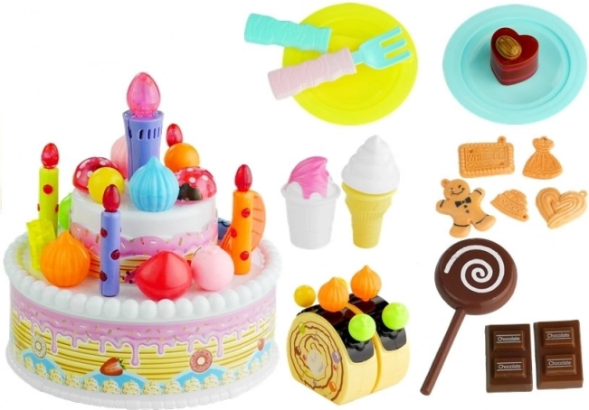 Ovaj igraći set za djecu donosi beskrajnu zabavu i razvija dječju maštu. Sadrži tortu, roladu, kekse, sladoled, čokoladice i sav potreban pribor za izvrsno igraće iskustvo. Djeca će cijeniti šarene i prijateljske oblike te pastelne boje koje stimuliraju njihov vid i dodir.